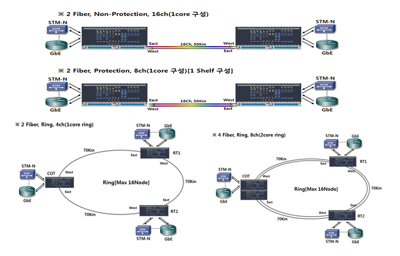 - CWDM 파장 사용 및 1 core 8채널, 2 core 16채널 무중계 70Km 전송 가능